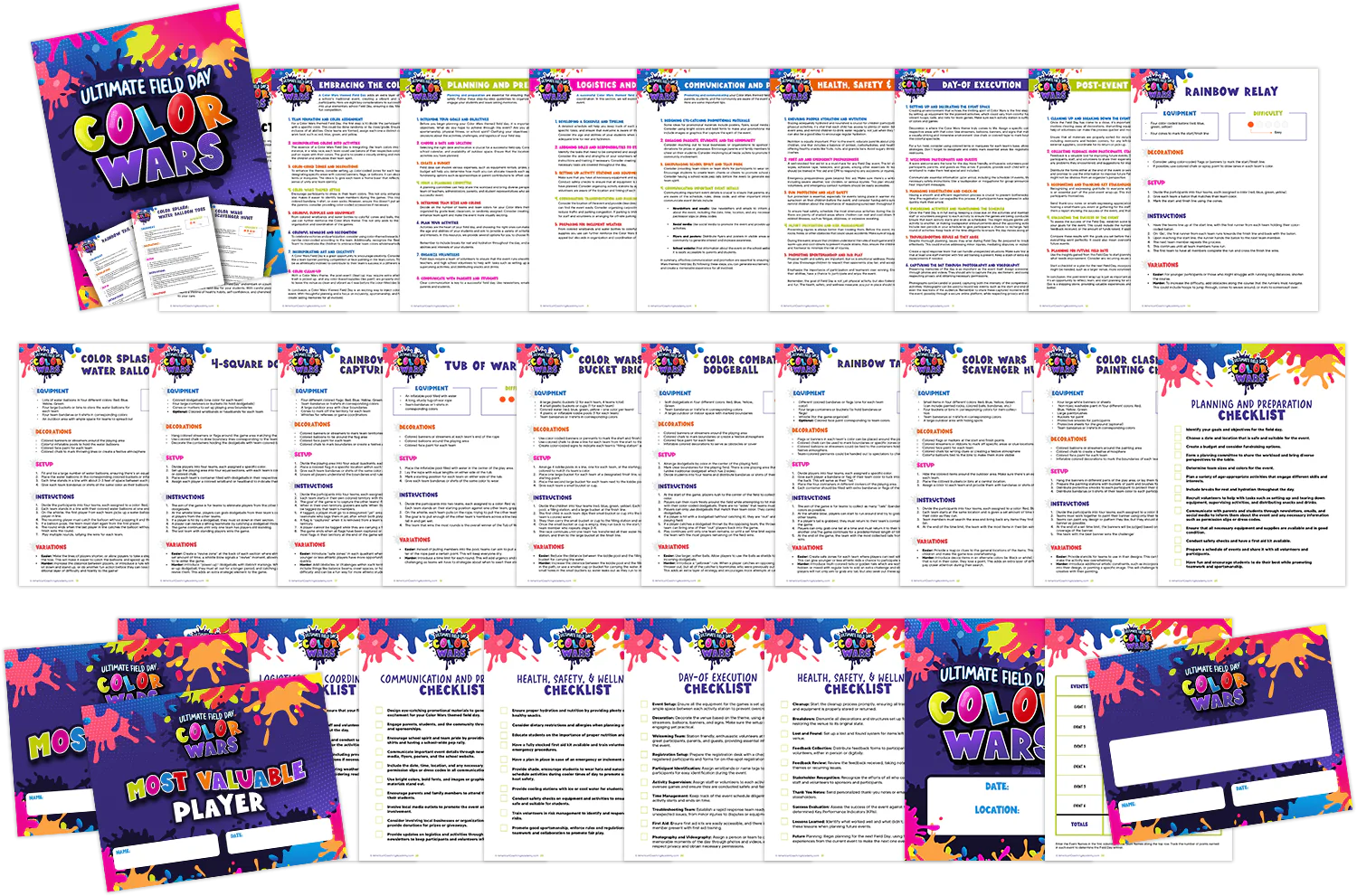 Imagine the looks of delight on your kids as they arrive to find an epic Color War in progress. Picture their excitement as they dive into the engaging activities you've arranged, guided by our time-saving checklists and printable tools.